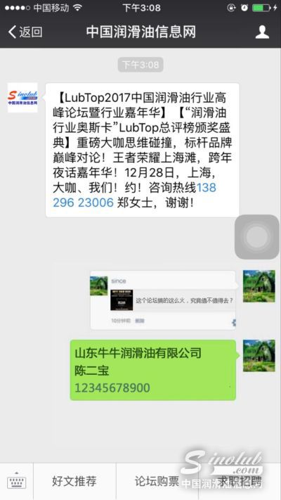 3、我们每天都会整理分享者的名单,每周从回复的朋友们中抽取3位幸运儿,送出我们价值4800元的“LubTop论坛暨LubTop总评榜颁奖盛典”门票一张。每期的中奖名单都会在我们“中国润滑油信息网”微信公众号公布,记得一定要查看哦!届时我们将安排工作人员与您联系领奖事宜。