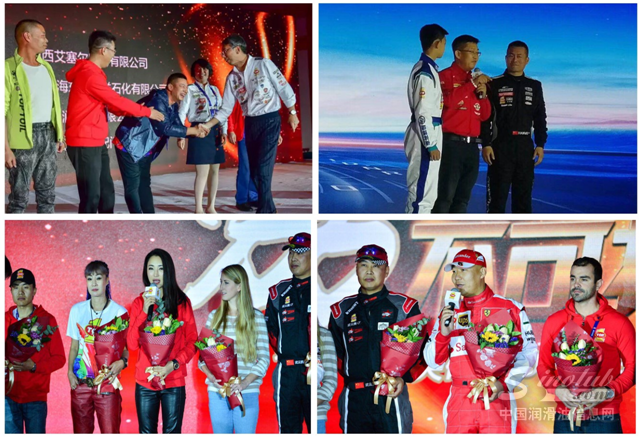 美国突破(TOP1)润滑油大中华区CEO李嘉先生为经销商颁奖(左上),冠军车手韩魏(右上)、铁骑丽影创始人严晗(左下)、火鸟极速车队车手代表(右下)分享感受
