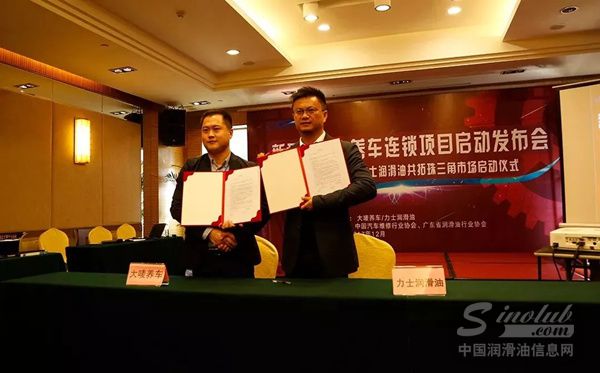 发布会同时举办了“大唛养车携手力士润滑油共拓珠三角市场启动仪式”,力士润滑油总经理陈振新先生表示:力士润滑油将与大唛养车通力合作,发挥各自优势,利用自身优秀的产品、携手丰富的经销网络资源,双方计划先期合作开发珠三角地区,在未来两年开设数百家养车连锁店。