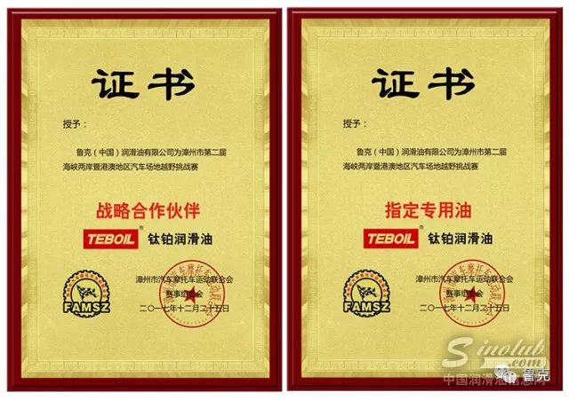 鲁克(中国)润滑油有限公司旗下“TEBOIL钛铂润滑油”品牌暨11月荣获“国际知名品牌”、“节能绿色环保推广产品”荣誉证书之后,又在刚刚落下帷幕的漳州市第二届海峡两岸暨港澳地区汽车场地越野挑战赛中,成为赛事“指定专用油”及“战略合作伙伴”。