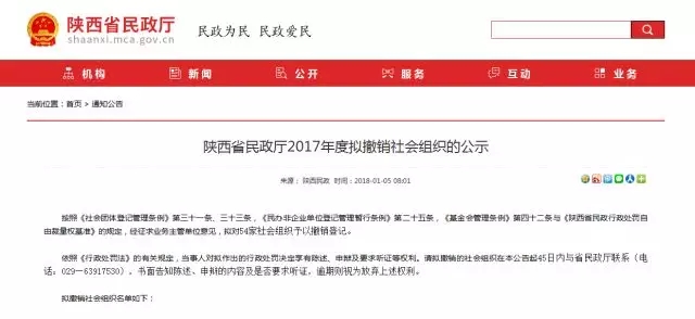 按照《社会团体登记管理条例》第三十一条、三十三条,《民办非企业单位登记管理暂行条例》第二十五条,《基金会管理条例》第四十二条与《陕西省民政行政处罚自由裁量权基准》的规定,经征求业务主管单位意见,拟对54家社会组织予以撤销登记。