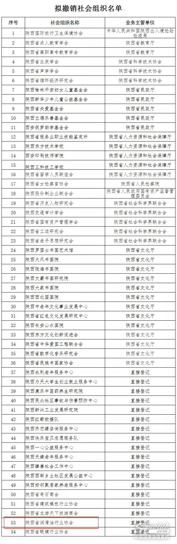 2018年1月5日,陕西省民政厅对外发布公告,拟对57家社会组织予以撤销登记。公告中,陕西省润滑油行业协会赫然在列。