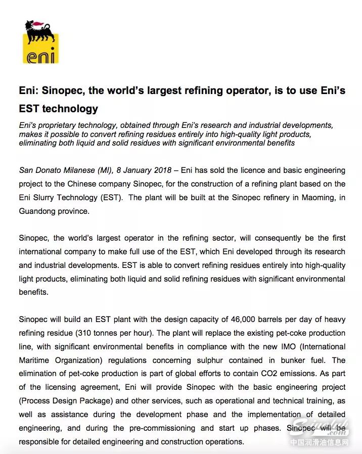 2018年1月8日,在圣多纳托米兰,埃尼和中石化达成了最新合作——埃尼的悬浮床裂化技术(EST),将被应用于中石化在建的广东茂名炼油厂项目。