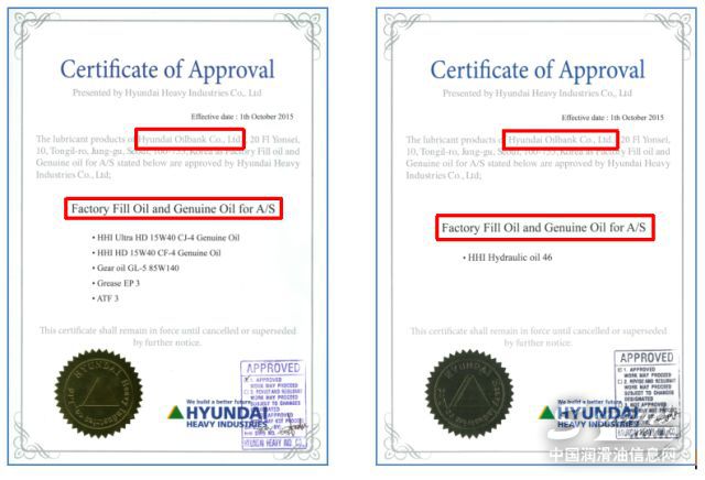 韩国现代炼油株式会社(又称HYUNDAI OILBANK(株))是由现代重工业集团控股的、归属于韩国现代集团的跨国能源公司,负责为现代重工业集团生产和供应原装配套润滑油产品,产品英文名称“HYUNDAI Genuine Oil”,中文名“现代建设装备专用油品”。该系列产品均经过现代重工集团总部授权及认证,是我司总部专为现代重工设备研发的高端润滑油产品,我司简称之为”现代重工纯正油品”。