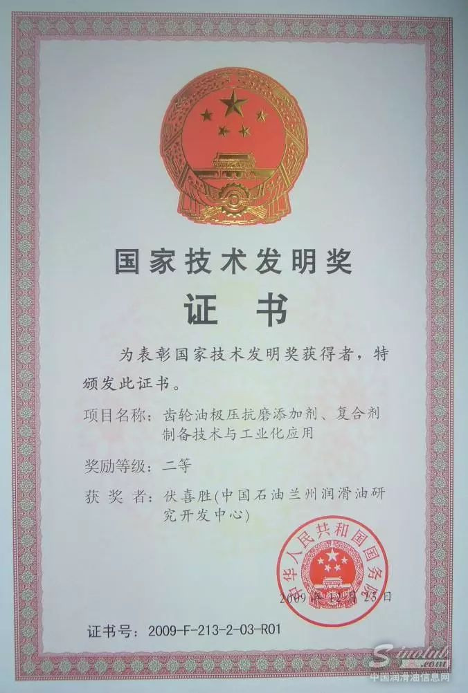 “齿轮油极压抗磨添加剂、复合剂制备技术与工业化应用”获得2009年国家技术发明奖二等奖,技术应用于汽车、钢铁、风电行业及军事装备中,使高端齿轮油市场份额达到30%。