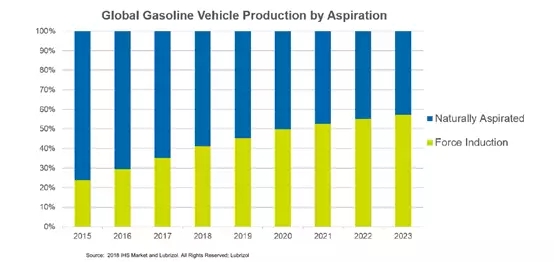 涡轮增压技术的应用也将逐年增加。到2023年有超过一半的新车将采用涡轮增压技术。