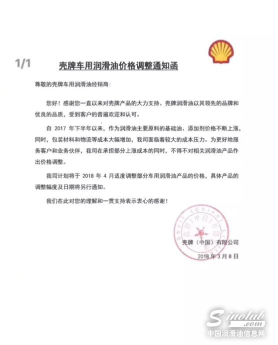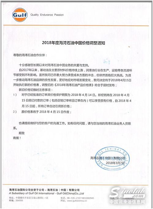 中国润滑油信息网(sinolub.com)从市场获悉,继日前美孚、嘉实多、SK、长城、康普顿、龙蟠、TOP1宣布涨价后,壳牌、道达尔、加德士、GULF海湾润滑油发出润滑油价格调整通知函,将于2018年4月开始执行新的价格表。目前,全球知名润滑油领军品牌美孚、壳牌、嘉实多都称应“成本压力”,“不得不”作出“一个艰难的决定”,宣布涨价。