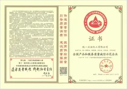 此外,统一石化更多次获得产品质量、诚信经营各项荣誉证书, 包括全国质量信得过产品、全国质量诚信标杆典型企业、中国质量检验协会团体会员单位证书等。
