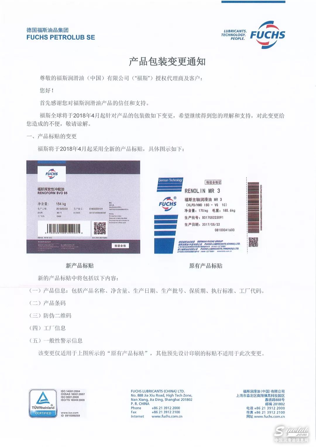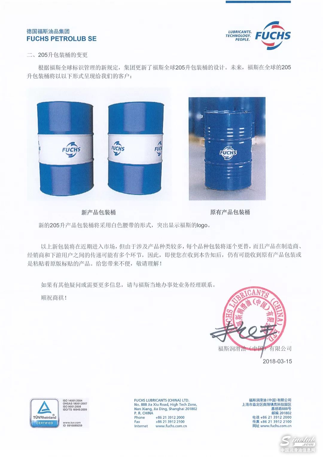 尊敬的福斯润滑油(中国)有限公司(“福斯”)授权代理商及客户: