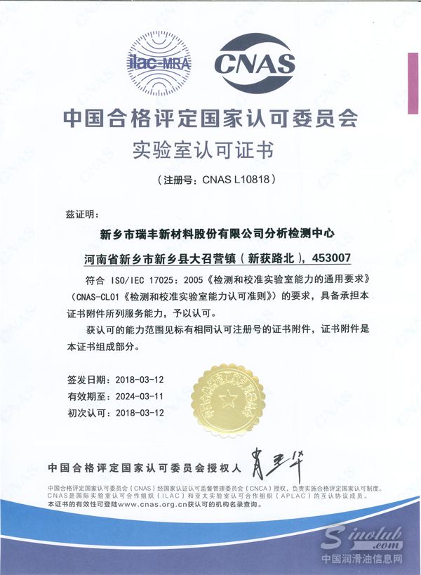 CNAS是经国家认证认可监督管理委员会批准设立并授权的目前国内唯一一家有资格颁发国家认可实验室的机构。此次CNAS认证的检测领域为润滑油添加剂检测,检测项目涵盖了:元素测定(钙、锌、磷、镁等21种元素) 、运动粘度、密度、总碱值以及闪点等16个检测项目,申请的检测仪器设备包括电感耦合等离子发射光谱仪、电位滴定仪、石油产品水分试验器、微机库仑测硫仪、石油产品运动粘度测定器等20余台(套)。