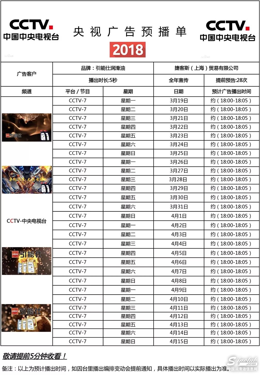 ENEOS引能仕在中国市场已经获得越来越多的消费者的肯定和喜爱。为了能让更多的爱车人士了解ENEOS引能仕品牌,2018年在全国范围内加强了ENEOS的品牌推广力度,启动新一轮品牌推广策略,并在央视媒体CCTV-7投放了品牌广告,如果您错过了电视台的播放时间,还可以点击下方视频观看,快来一睹为快吧!