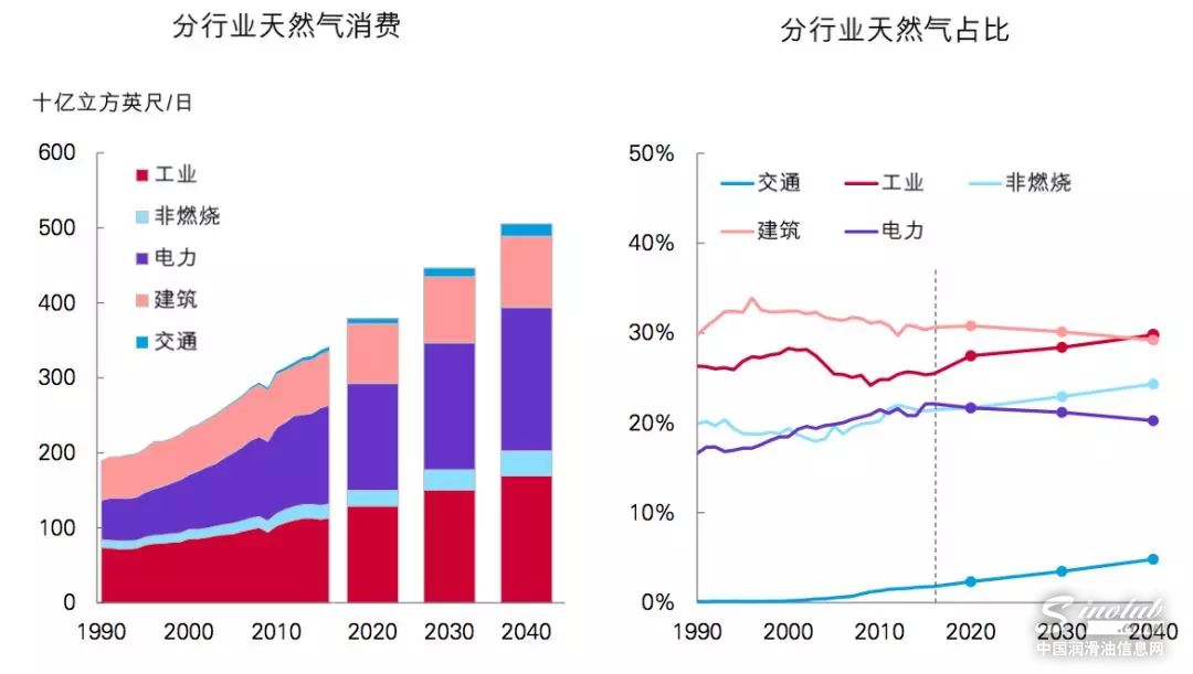 ◆交通领域天然气需求增长最快 , 因为天然气越来越多地被用于卡车运输和海运 。虽然交通行业需求增长的绝对值很小 ( 110亿立方英尺/日), 可交通行业内的天然气占比到2040年将增加到近 5% 。