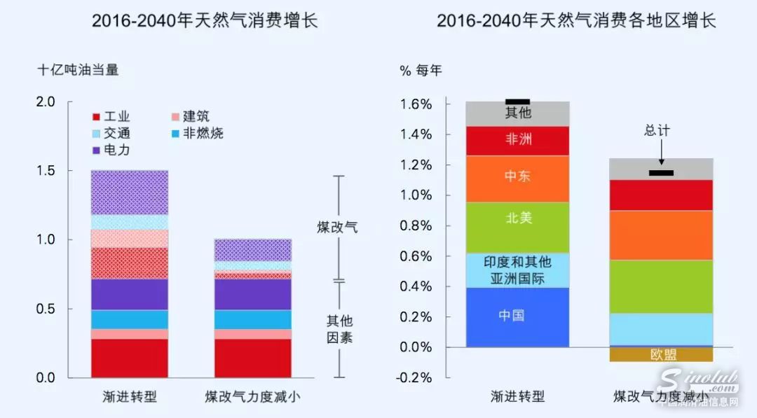 ◆考虑一个备选情景在政策发挥着最大作用的两个地区 (亚洲和欧盟) 没有煤改气的推动 , 同时交通行业的油改气也十分有限。在这一 “煤改气力度减小 ” 的情景下,天然气增长约为年均 1.1% ,而不是渐进转型情境下的年均 1.6% 。