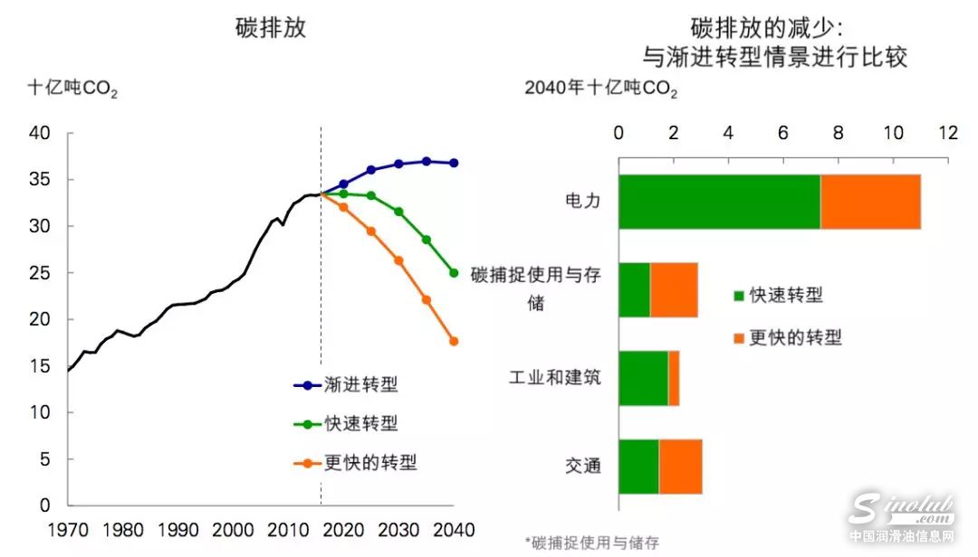 ◆在 “更快的转型” 情景下碳排放会大幅下降其下降幅度大致与国际能源署“ 可持 续发展情景” 中一致, 即到2040 年 ,碳排放下降约 50%。