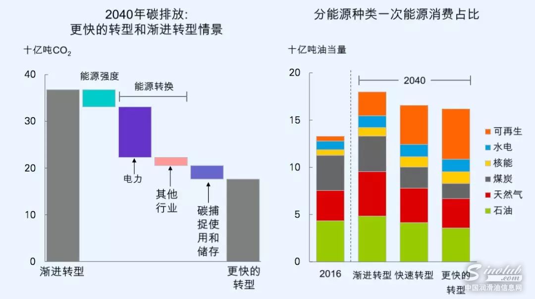 ◆在更快的转型情景下 ,能源结构的碳强度显著低于渐进转型情景。到2040 年 , 可再生能源总量将超过全球能源的总增长量 ,在一次能源中的比例将提升至约二分之一 。