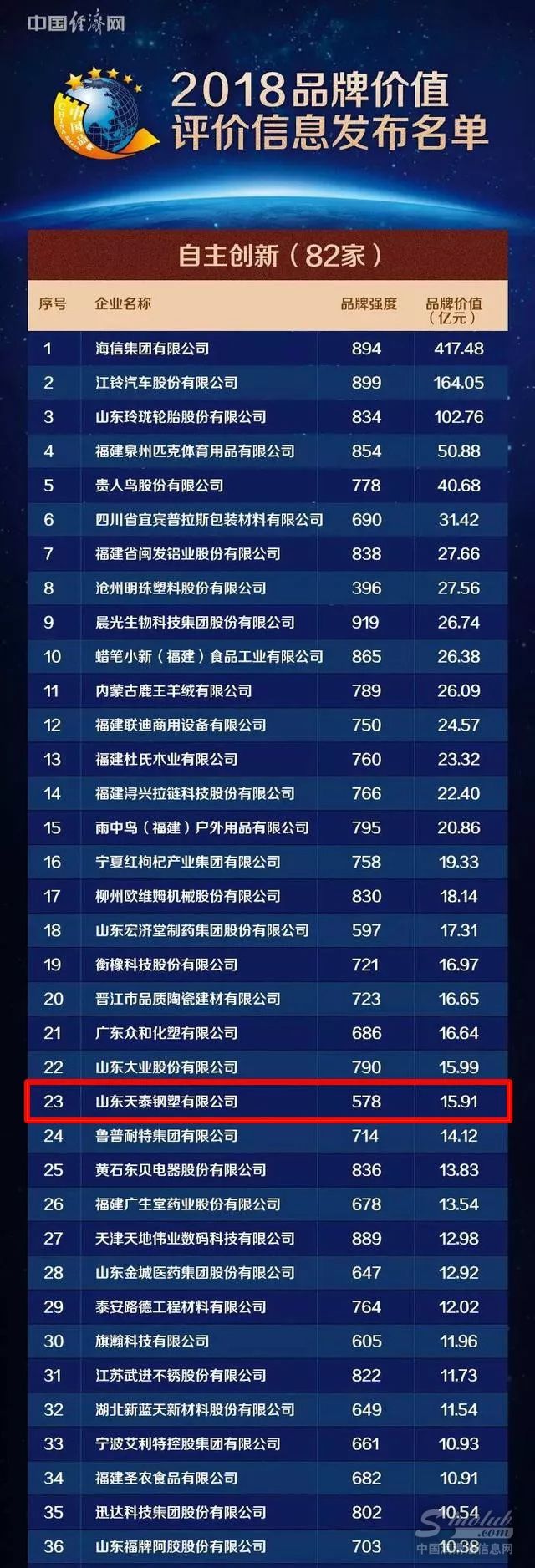 2018年5月9日,由中国品牌建设促进会、经济日报社、中国国际贸易促进委员会、中国资产评估协会等单位联合举办的“2018中国品牌价值评价信息发布”活动在上海举行,活动发布了总共718个品牌的品牌价值,其中天泰公司以品牌强度578,品牌价值15.91亿上榜。