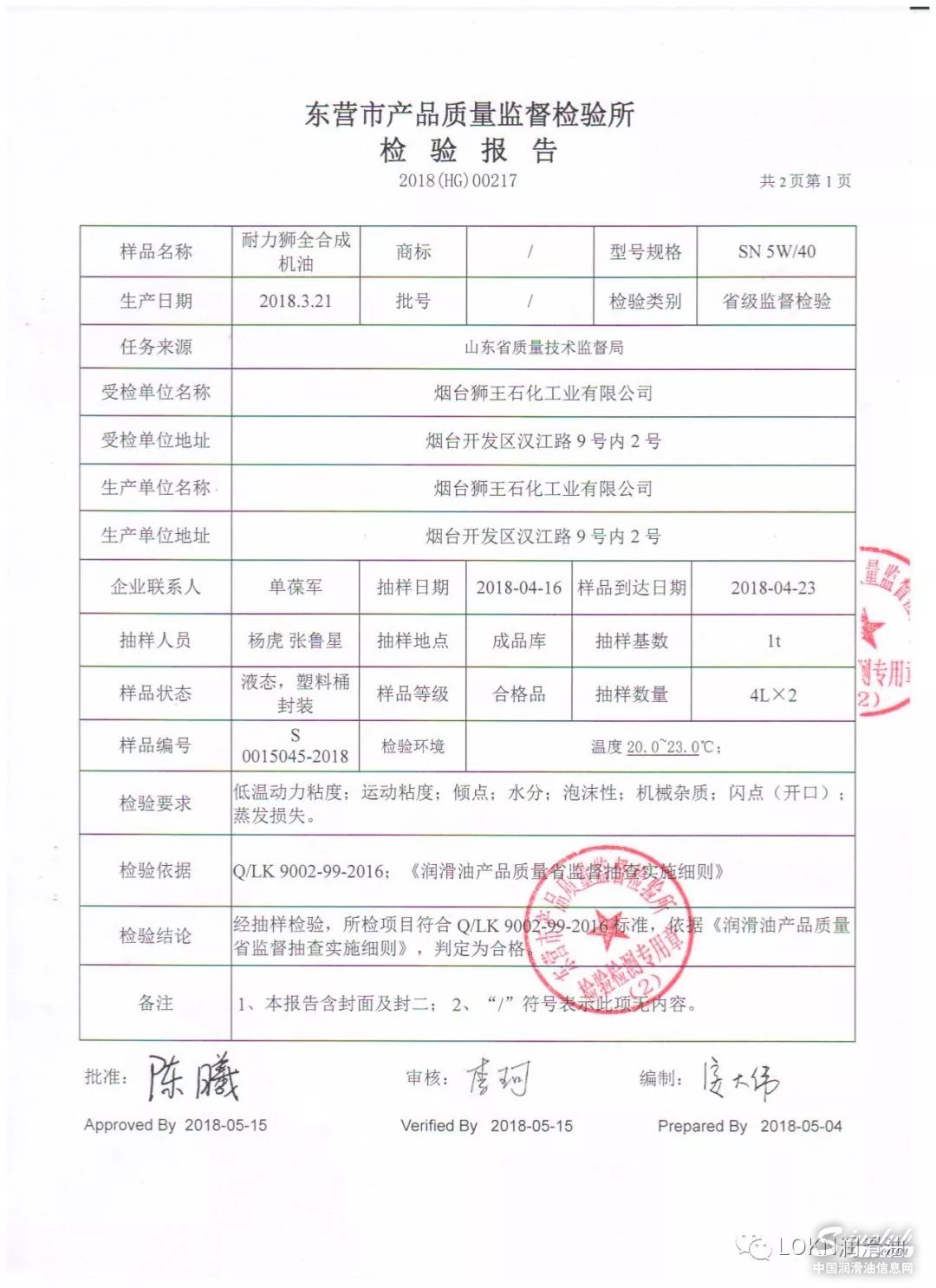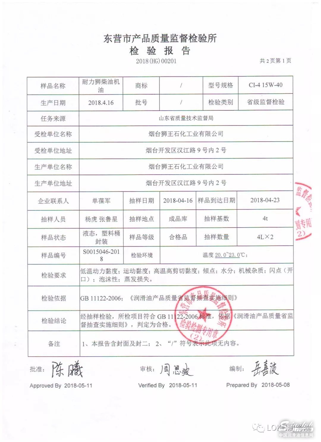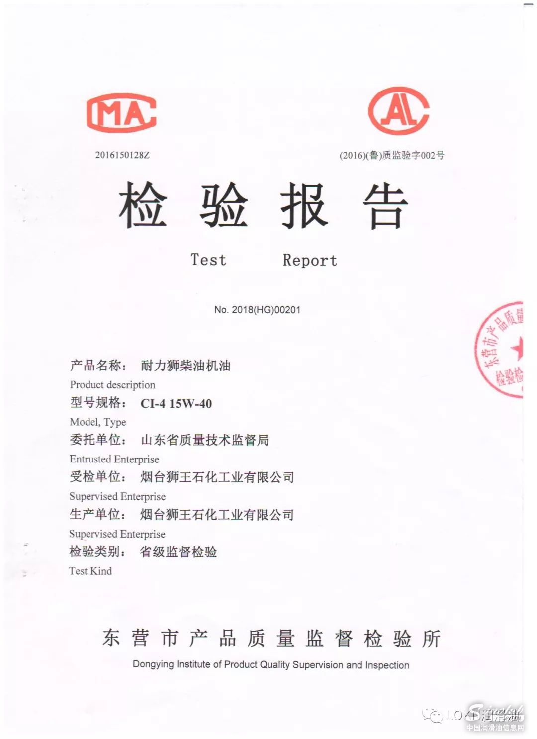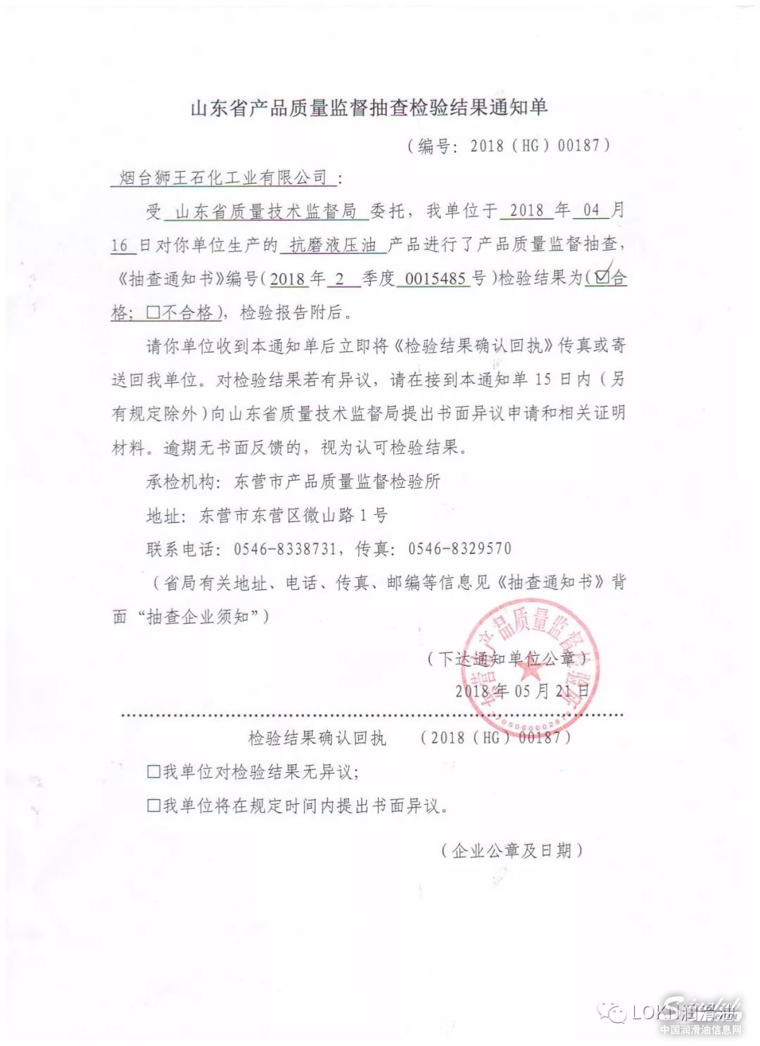 2018年4月16日,LOKN公司旗下汽机油、柴机油及抗磨液压油等产品接受山东省质监局抽样检查,抽检结果显示----全部合格。这是继LOKN油品通过ISO9001认证、API认证、奔驰认证等一系列行业肯定之后的又一国家权重级的权威品质肯定。