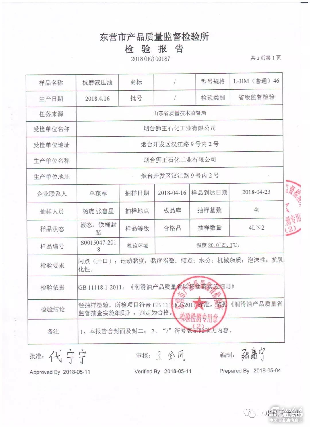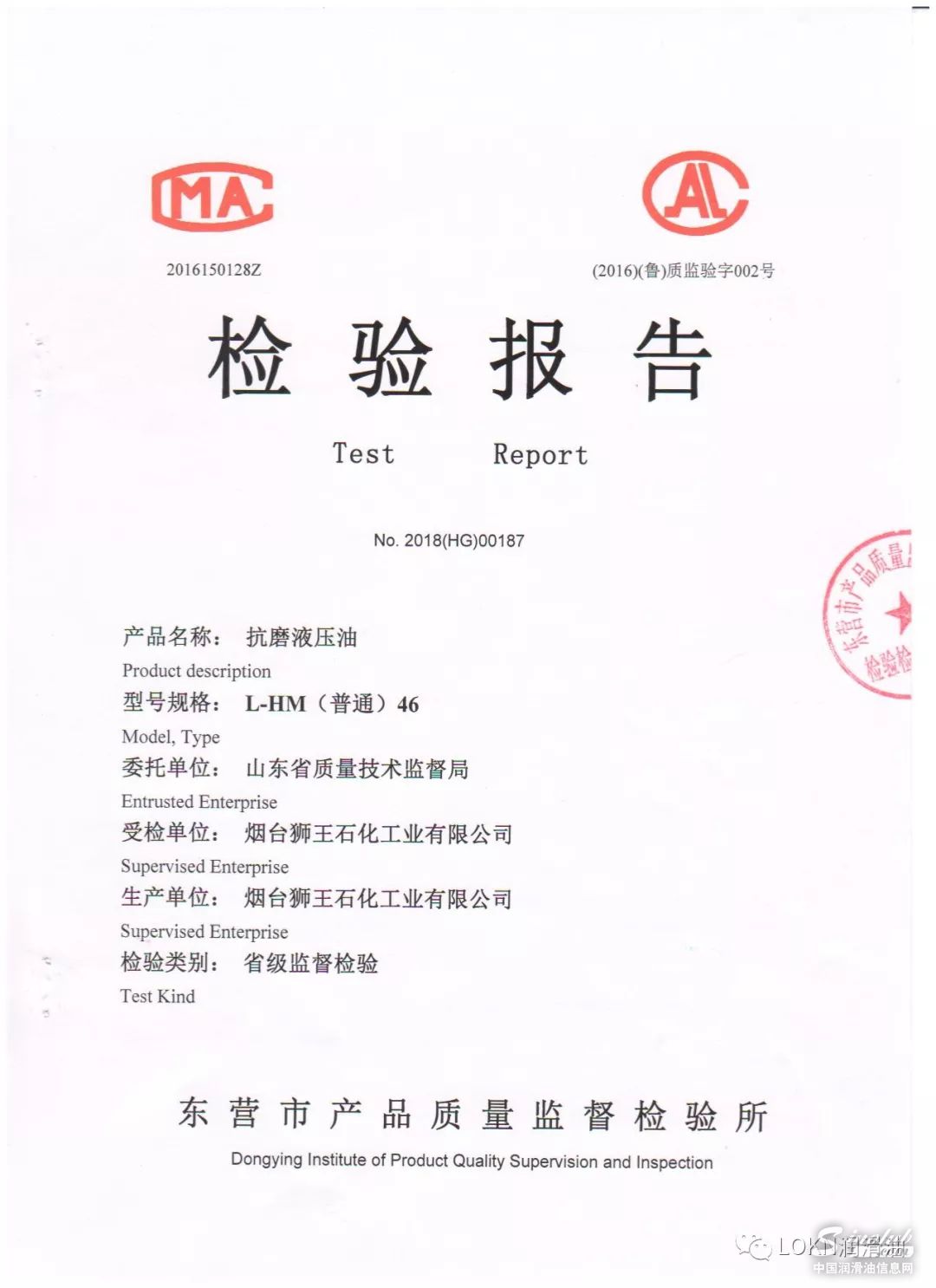 山东省质监局 L-HM 46# 抗磨油检验报告