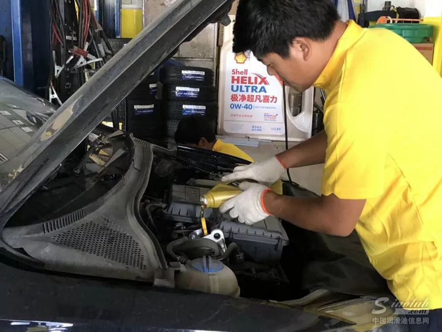 过了大约1个小时,终于轮到笔者换机油。只见汽修工熟练地将车内旧机油排出,然后开始加入黑色包装的生物基1号,据说这款机油是丹弗主推产品,效果非常不错,笔者不禁心里暗喜。