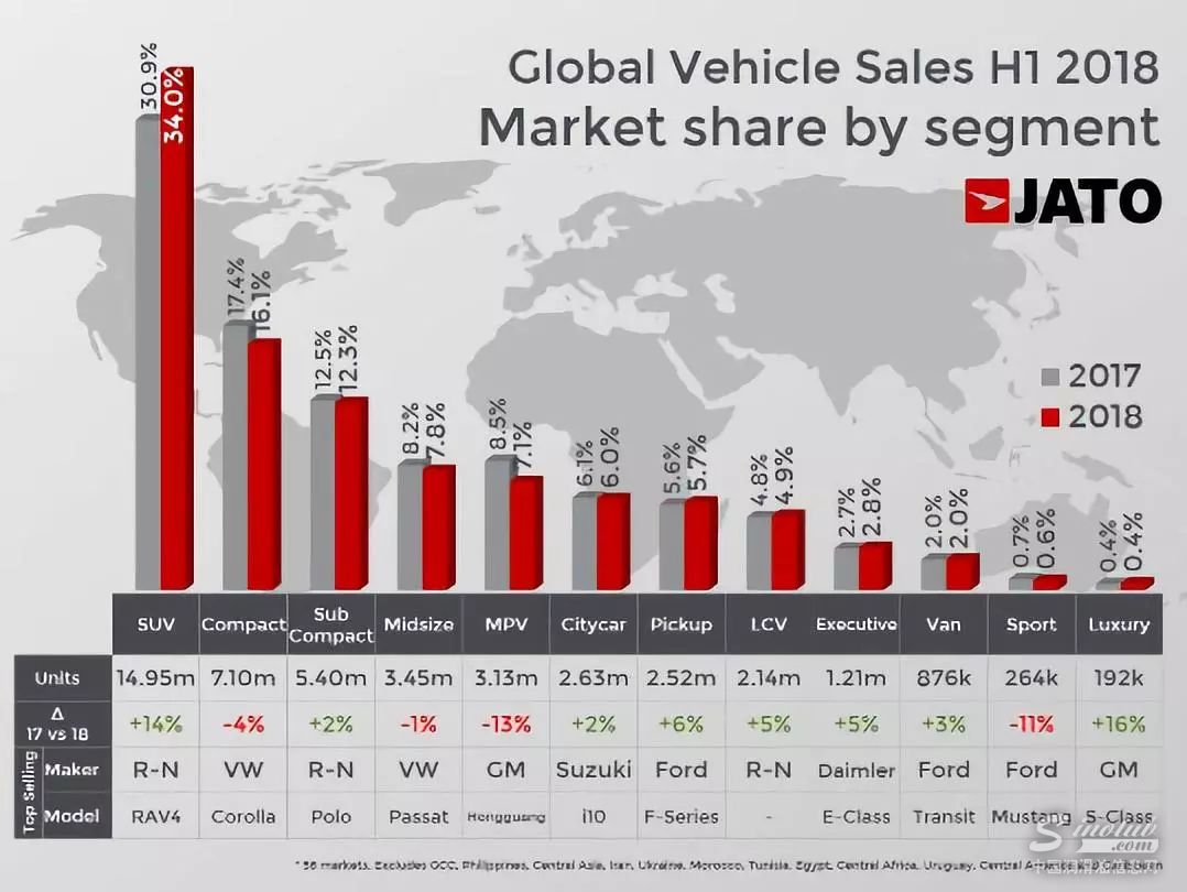 SUV的主导地位有所上升,上半年,全球SUV共售出约1,495万辆,同比增长14%,占全球乘用车销量的36%。SUV在美国、中国、加拿大和俄罗斯很受欢迎,但在拉丁美洲、日本和印度仍不及其它车型。这表明SUV在关键市场仍有增长潜力。
