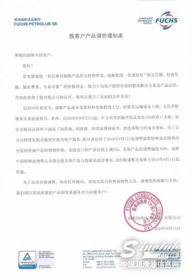 无独有偶,福斯润滑油(中国)有限公司8月15日发布调价函表示,“自2018年初至今,福斯产品成本受原材料价格持续上行,包装及运输成本上涨,人民币贬值等多重因素挤压。此外,自2018年8月23日起,中方对美国输华商品加征25%的进口关税,加征关税商品清单中涵盖了润滑油、润滑脂、润滑油基础油等,也造成极大的成本增加。”“公司决定将于2018年9月1日起调整福斯特种油部销售的全线润滑油产品的销售价格:美国进口的产品价格上调25%,其他产品的调整幅度为8%。”