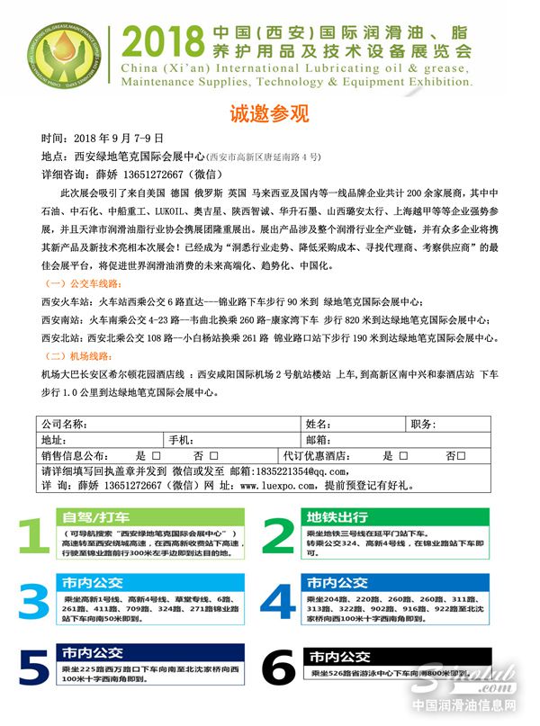 中国国际润滑油、脂及技术设备展览会(简称:中国国际润滑油展会)是由北京鼎成创赢国际展览有限公司倾力打造“一年两届专业油品展会”,多年来吸引十几个国家及地区的展商和采购,展商累积达2000余家增长达430%,采购人数达6万余人,“中国国际润滑油展会”所产生的积极影响,让我们坚定了专业油品展会将是未来行业品牌宣传主体的想法,同时也为达成这一目标而努力。2018年9月7-9日西安国际润滑油品展会欢迎您。
