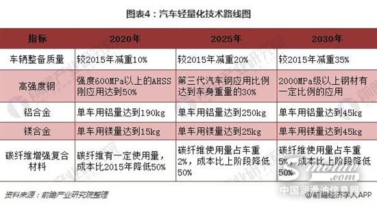 按欧洲和我国的汽车油耗评价方法,对于乘用汽油车,每降低100kg,最多可节油0.39L/100km。根据工信部发布的《乘用车燃料消耗量第四阶段标准》:到2020年,乘用车新车平均燃料消耗量达到5升/百公里;到2025年,乘用车新车平均燃料消耗量比2020年降低20%。