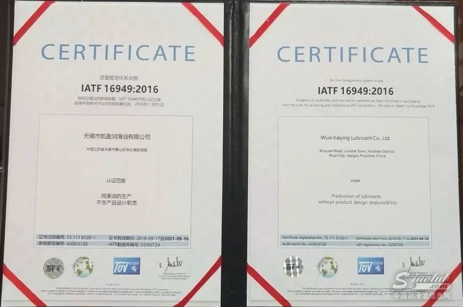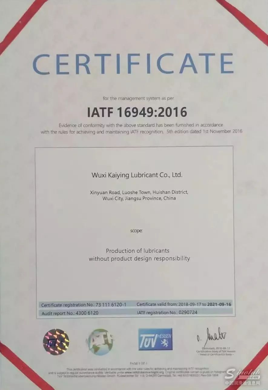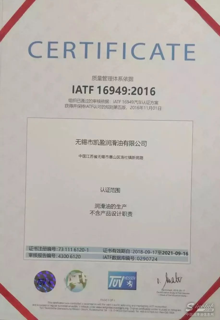 获得IATF16949认证意味着凯盈润滑油已拥有完备、有效的质量保障体系,这项认证对于凯盈润滑油的客户至关重要,因为凯盈润滑油已对原有的质量控制流程进行了系统性的改进和完善,大大提高了质量管理的有效性和效率。