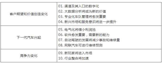 1、客户期望和价值创造变化(渠道及其入口的数字化、大数据分析将成为新的价值、专业化车队管理将愈发重要、新兴市场和服务意识将进一步提升);