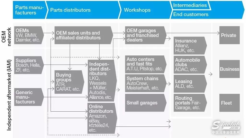 售后市场的公司一般被分为两类,一是OEM网络,二是独立售后市场。在这两个类别中,存在5个独立又相互关联的利益群体:配件制造商、配件分销商、维修门店、中间商和终端客户。