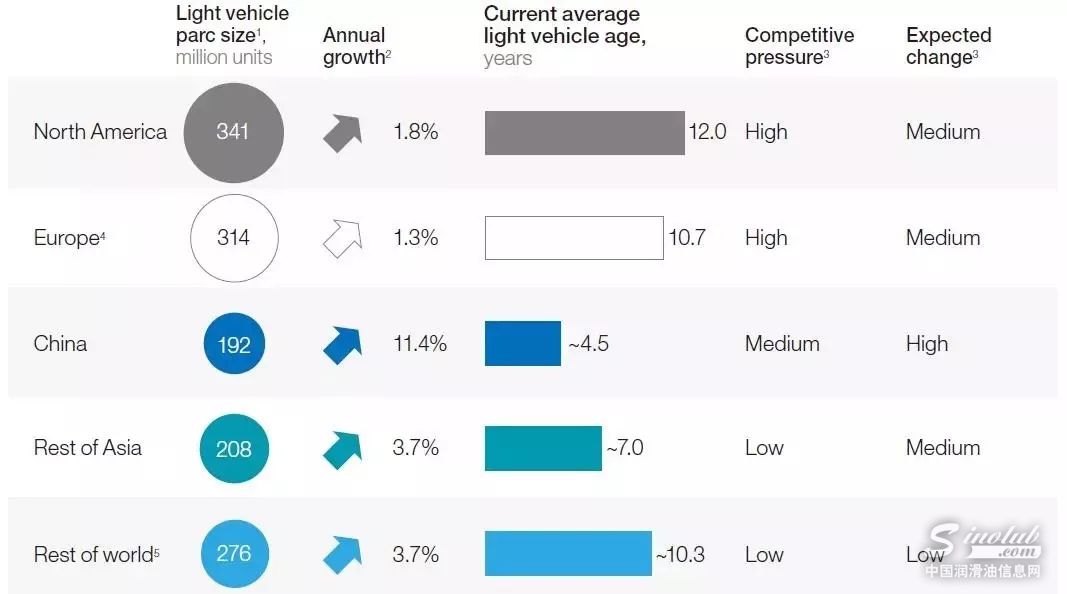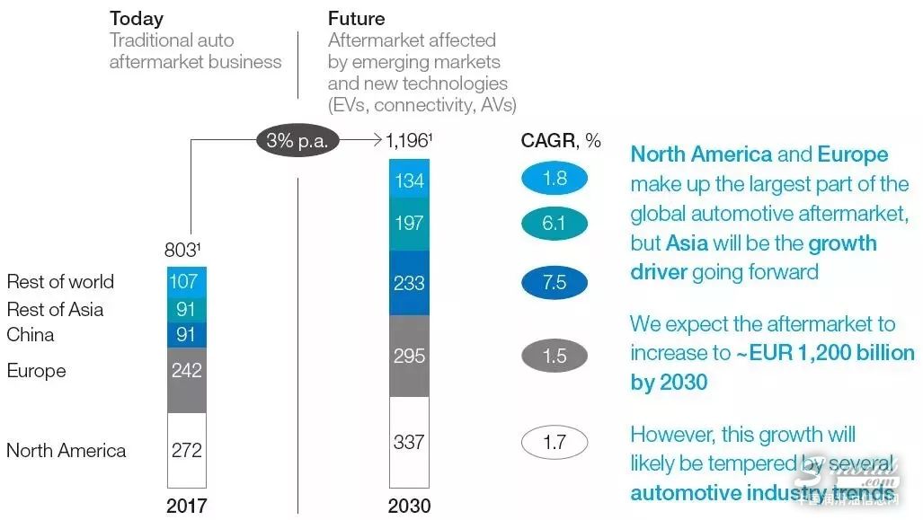 在成熟市场,过去几年后市场的增长率只有1%-2%,预计这种平稳性增长将持续下去。到2030年,北美和欧洲市场的后市场营收将分别达到3400亿欧元和3000亿欧元。由于这两个市场的平均车龄也在增长,其中的后市场玩家也要解决老车型的需求。