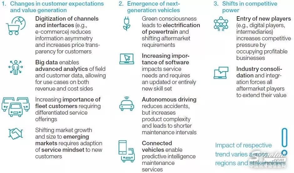 由于区域、市场规模和玩家不一样,这些趋势的表现形式和重要性也不一样。在此之后,我们将重点讨论这些趋势对后市场生态的影响,包括价值链、客户参与度、利润池等。