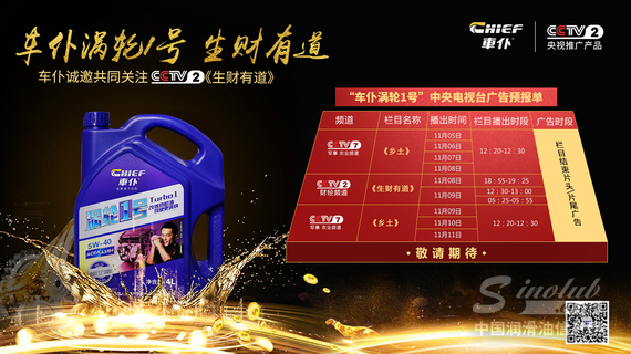 11月5日至11月11日,车仆涡轮1号润滑油央视广告在CCTV2财经频道的《生财有道》和CCTV7军事/农业频道的《乡土》栏目中多时段播出,引起广大消费者的极大关注。
