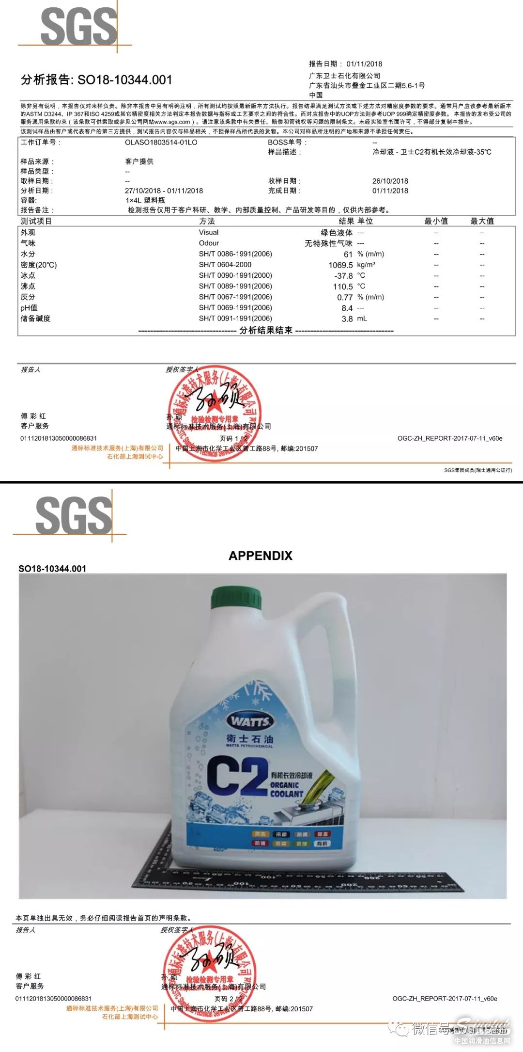 卫士C2有机长效冷却液已通过SGS检测认证机构报告!