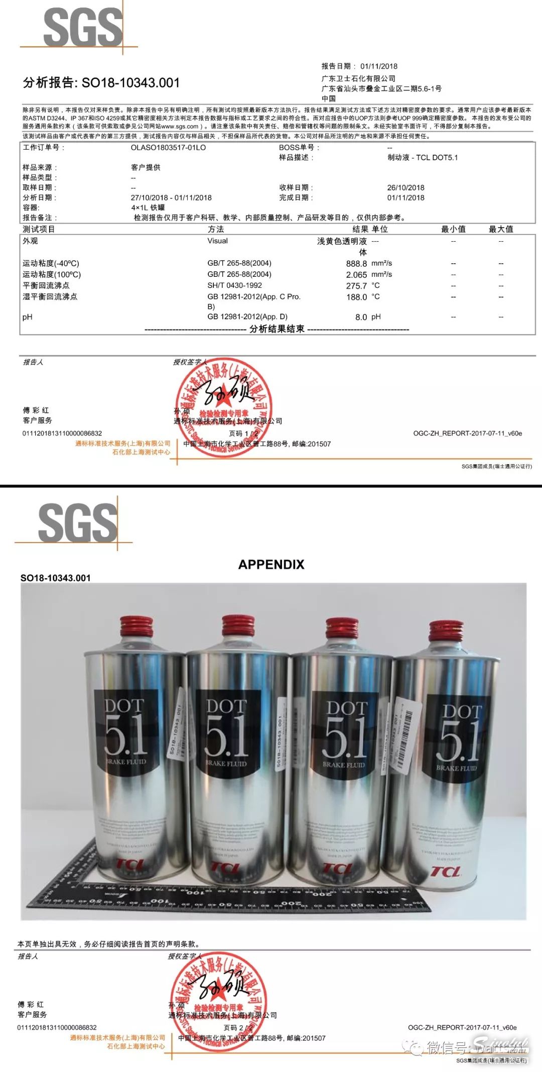 TCL刹车油5.1已通过SGS检测认证机构报告!