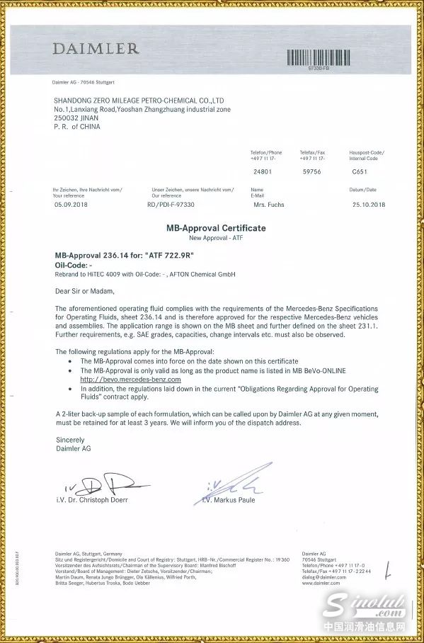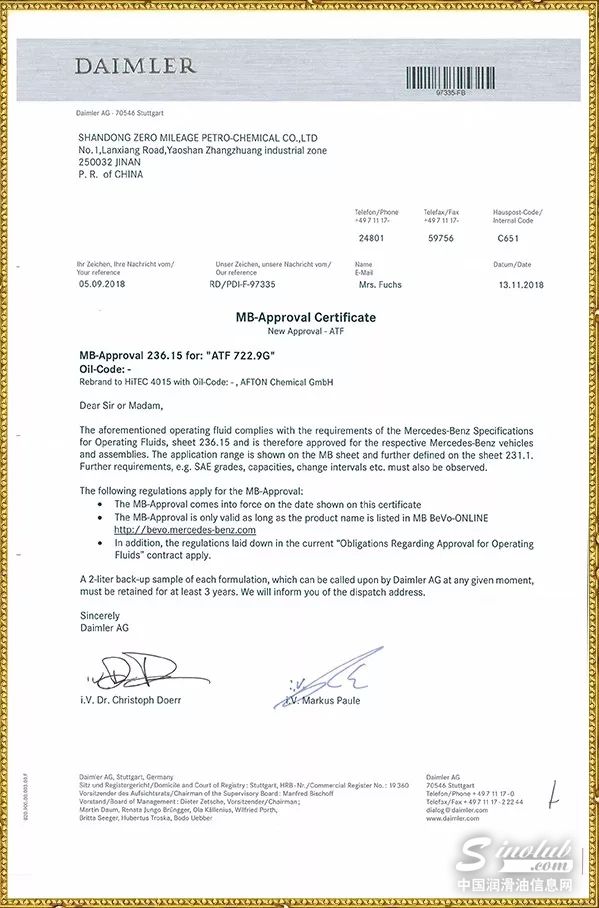 近日,德国奔驰公司认证零公里两款自动变速箱油品奔驰722.9R和奔驰722.9G分别通过MB236.14和MB236.15的标准认证!这是继零公里润滑油获得德国奔驰MB229.5以及捷豹路虎认证之后,又一项新的技术突破,再次验证了零公里润滑油的卓越品质。