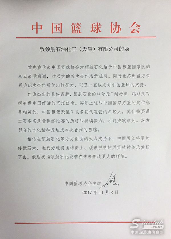2019年1月1日,领航润滑油与中国篮球协会正式续约赞助合作协议,将双方合作关系延续至2020年,进一步确立领航润滑油作为“中国国家男子篮球队官方赞助商”的品牌地位。