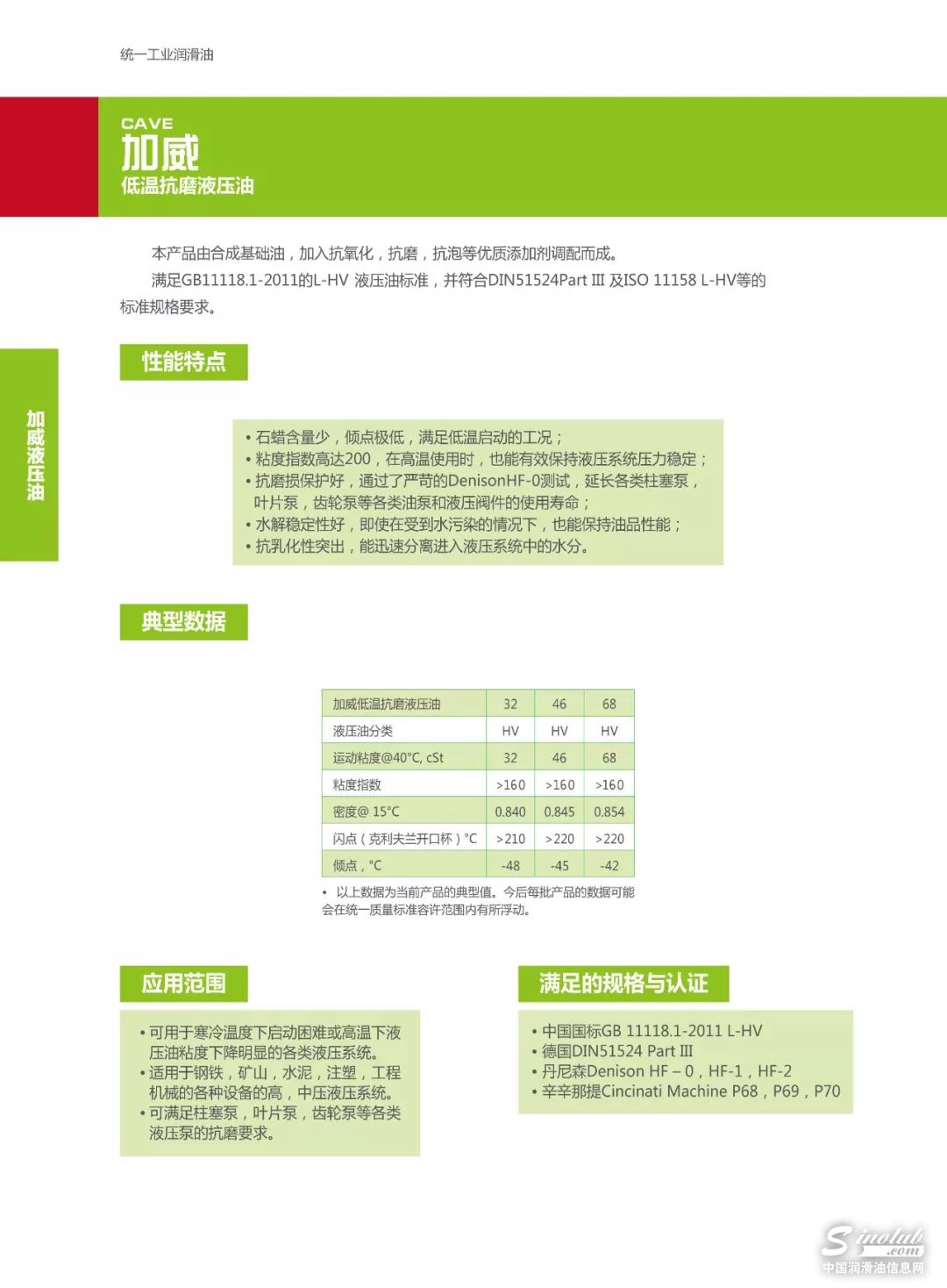 统一加威低温抗磨液压油:由合成基础油,加入抗氧化、抗磨、抗泡等优质添加剂调配而成,倾点极低,满足低温启动的工况。粘度指数高达200,在高温使用时也能保持液压系统压力稳定。水解稳定性好,在水污染情况下,也能保持油品性能。抗乳化性突出,能迅速分离进入液压系统中的水分。也正因为产品的优秀性能,而获得包括成都九鼎科技(集团)有限公司在内等众多大客户的认可与信赖。