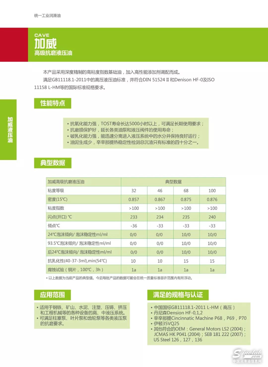 统一加威高级抗磨液压油:采用深度精制的高粘度指数基础油,加入高性能添加剂调配而成。抗氧化能力强,TOST寿命长达5000小时以上,可满足长期使用要求。抗磨损保护好,延长各类油泵和液压阀件的使用寿命。破乳化能力强,能迅速分离进入液压系统的水分并保持良好运行。