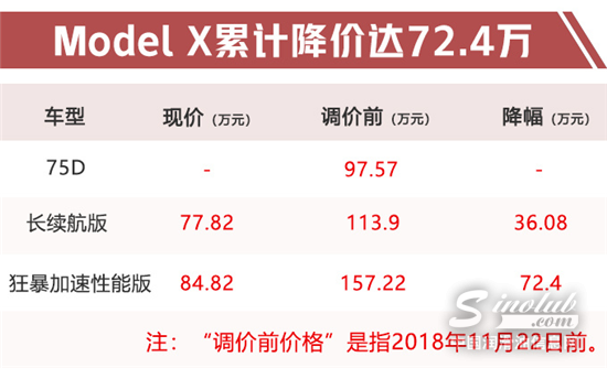 就在3月1日,特斯拉中国宣布,将再次调整特斯拉全系车型的售价:Model 3的降幅在2.6-4.4万元不等,Model S降价1.14-27.75万元、Model X降价17.43-34.11万元。其中,Model X 狂暴加速性能版的降价幅度高达34.11万元!而算上这次,从2018年11月至今,特斯拉已经针对中国市场连续3次下调了新车售价。