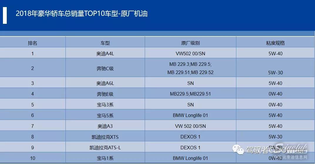 后来,我又看了一下豪华车排名的原厂规格,在奔驰宝马奥迪凯迪拉克路虎沃尔沃这些豪华车的2018款原厂机油规格中,已经看不到SN的影子了,除了美系凯迪拉克用通用的DEXOES1以外,其它那些豪车品牌都是欧标机油,比如A3B4A5B5C2C3C5或者基于这些欧标比这些欧标更高的原厂级别,粘度方面是2030为主40少见。为什么SN不在豪车的选择当中呢?因为欧标远远高于SN的要求。总之就是,机油似乎只有SN矿物SN半合成SN全合成了,但在我眼里级别和粘度的选择变得复杂了,所以我提出了一个概念,叫适配级。