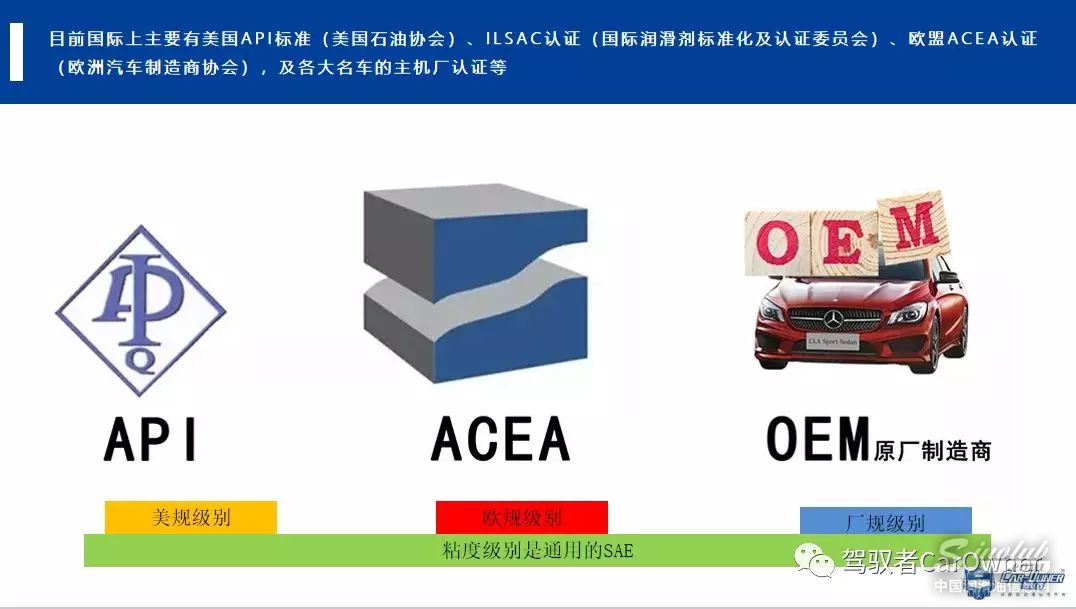 说到机油的级别呢,全球有三大流派,一个是美规,一个是欧规,还有一个就是整车厂自己的级别规格,称为OEM规格。