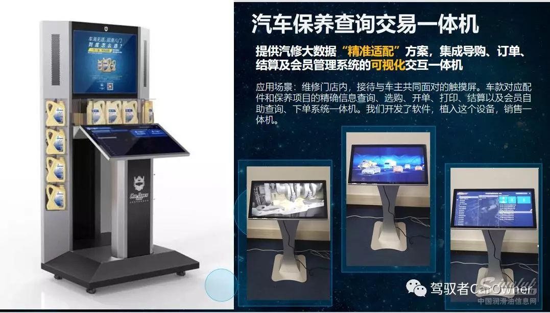 不仅是车主,即便是维修技师也总是不能正确推荐机油。成千上万种车款对上百种机油的级别规格,我也没法说清楚具体什么车该推荐那种机油规格。靠培训做知识传递是不可能的任务,我就想,如果门店内有一种傻瓜式的自助查询终端机,把车辆信息和原厂参数以及推荐的适配机油都装进去,让技师和车主共同使用,一目了然是不错的场景。所以我创办了一家科技公司,做了一种汽车保养适配查询交易一体机。就是这样一种傻瓜式的查询设备。而且不仅仅是查机油,连变速箱、制动系冷却系空调系轮胎轮毂易损件等全车养护项目都能查,多少公里做什么养护,正确选择什么产品应有尽有,还能支持下单打印结算。无论是机油厂家还是经销商或者门店,我都能把他们经营的具体品牌的产品对应到具体车款上,顺便就帮他们调整了对机油级别的认知,把适配级的概念进行了推广。现在机油品牌泛滥,去到门店推销机油连坐下来谈的机会都没有,因为门店不缺机油。所以大家整天在想门店缺什么?我看就缺这种场景化的自助终端设备,让接待和车主共同面对,信息对等,公平透明。