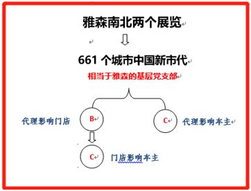 综合雅森展览的多篇报道,我们理一理这个“中国新市代”的做法,画个图来看看,就更加有意思了,原来是一个从上到下信息垂直+新农村包围城市的大局。