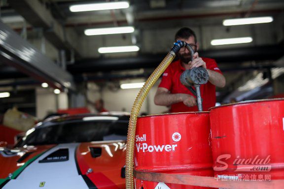 (维修车间,工作人员将壳牌V-Power能效燃油注入法拉利赛车)