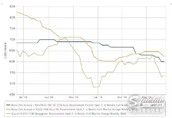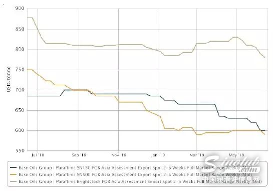 亚洲地区一类高粘500SN和BS光亮油FOB/CFR市场价格均有下滑,150SN继续保持较低市场流通。