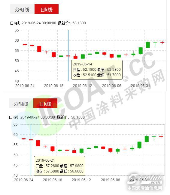 据涂料采购网了解,此次伊朗击落美国无人机事件,使得局势变得更加紧张,另外,市场预期美联储可能会在下次议会上降息,以刺激全球最大石油消费国的经济增长,以及美国石油库存下降等。市场担心会引发两国军事冲突,影响中东原油付运,油价受支持。此外,近期一些国际方面也发生了其他重大事件,共同推动本周国际油价大涨近10%。
