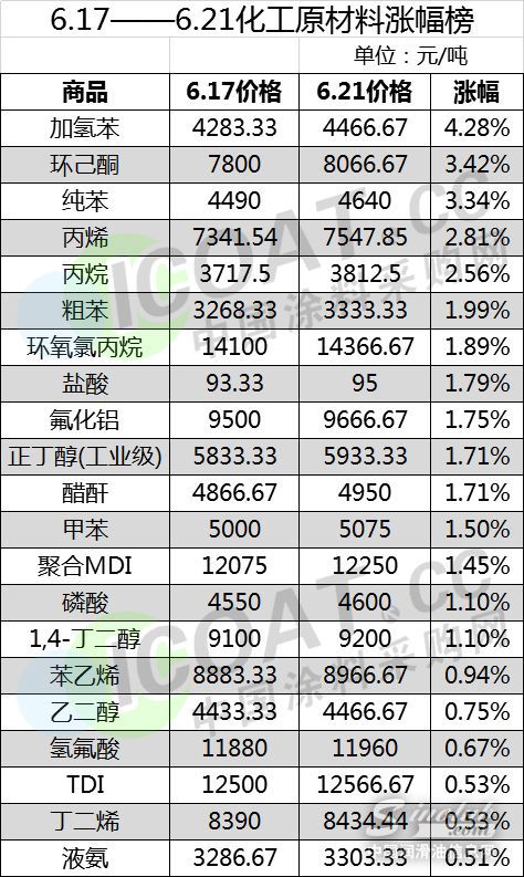 通过以上数据可以看出,有21种原材料价格相比上周初期有所上涨,涨幅最大的是加氢苯,可用于制氢、加氢、预蒸馏,生产高纯苯、硝化级甲苯、二甲苯、非芳烃、溶剂油等。其价格上涨183.34元/吨,涨幅高达4.28%。环己酮和纯苯位列涨幅榜第二名和第三名的位置,涨幅分别为3.42%和3.34%。