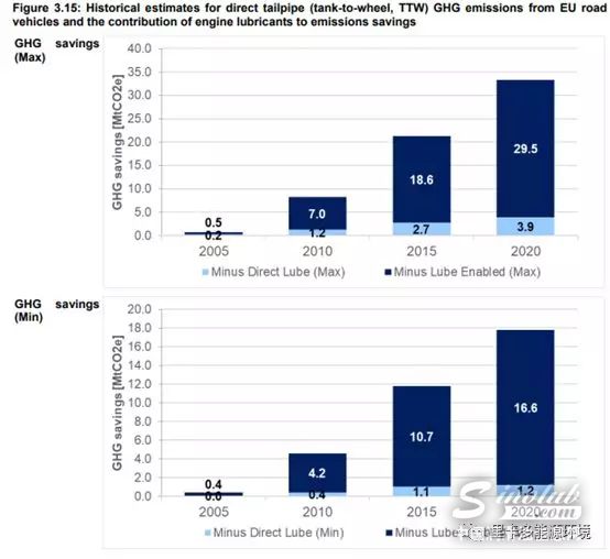 报告估计,到 2020 年,发动机润滑油技术的直接效益相当于每年减排 120-390万吨二氧化碳当量(与 2005 年的润滑油技术相比),而到 2030 年,每年还将进一步减排 90-270 万吨二氧化碳当量。如果将间接效益也纳入考虑范畴,例如在润滑油化学没有发生重大变革的情况下不可能实现的各种技术效益,那么到 2020年,减排总量估计每年可达 1780-3340 万吨二氧化碳当量,而到 2030 年,减排总量每年还可进一步提高 600-900 万吨二氧化碳当量。