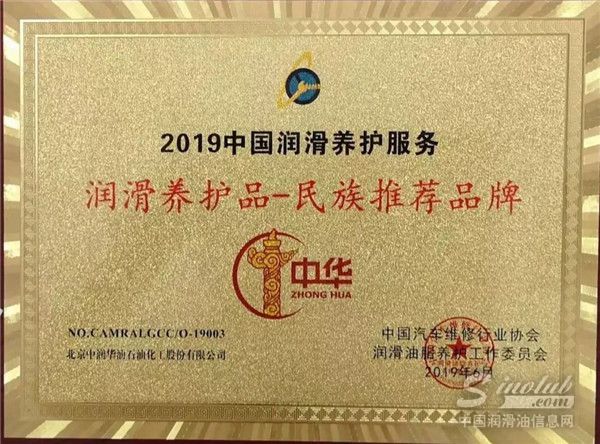 2019年6月,由中国汽车维修行业协会指导,中国汽车维修行业协会润滑油脂养护工作委员会主办的2019中国润滑养护服务“推荐品牌”颁奖典礼在南京成功召开。中华润滑油荣获“润滑油养护品——诚信推荐品牌”、“润滑油养护品——民族推荐品牌”两项大奖。